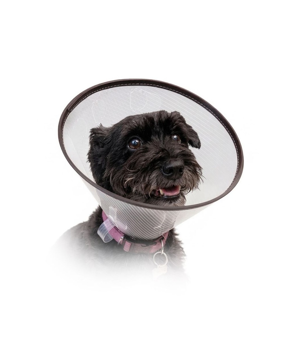 Protective snap-on collar for animals is soft and flexible. Used after surgery to prevent the animal from licking wounds. The collar is made of transparent polypropylene. It can be conveniently adjusted to the circumference of the animal's neck and has a "click" fastening.